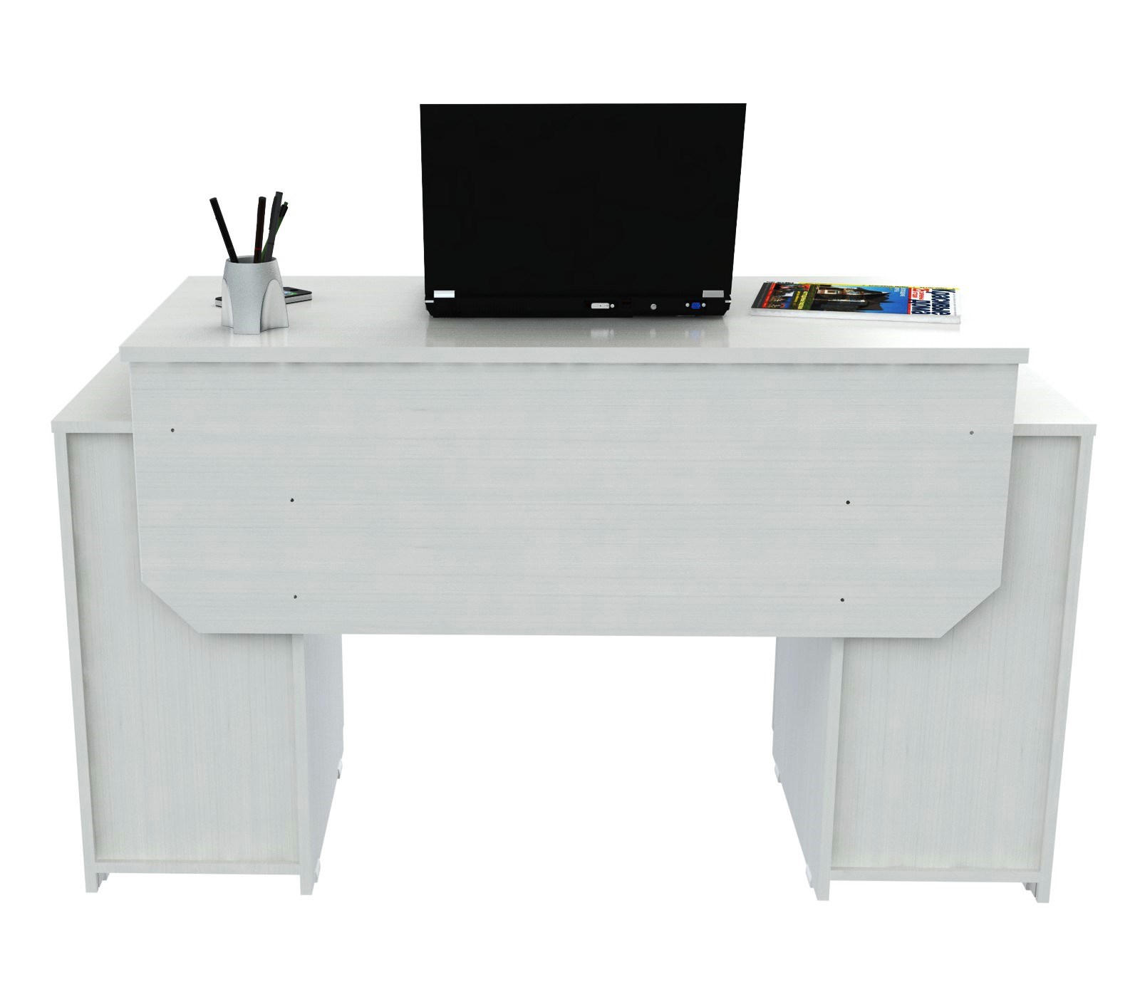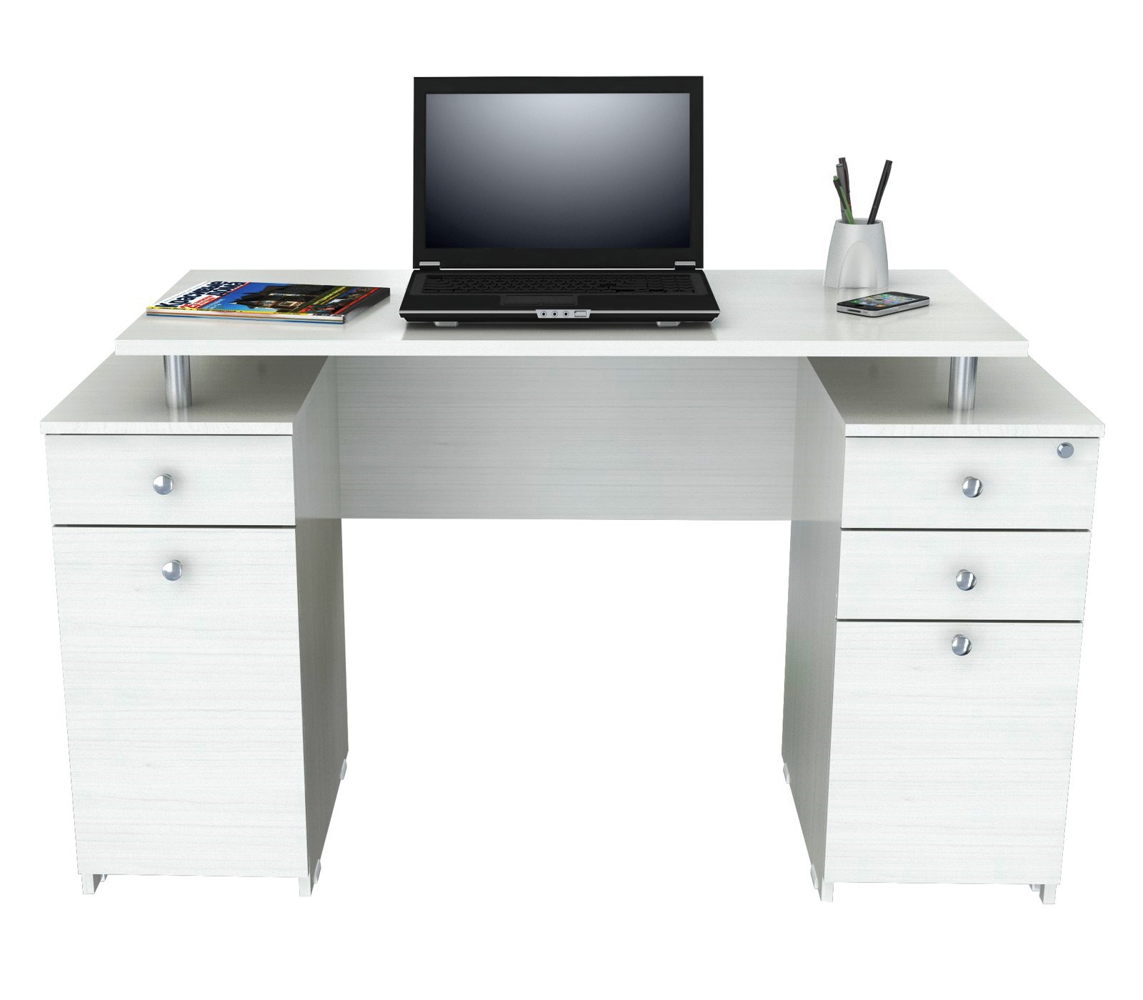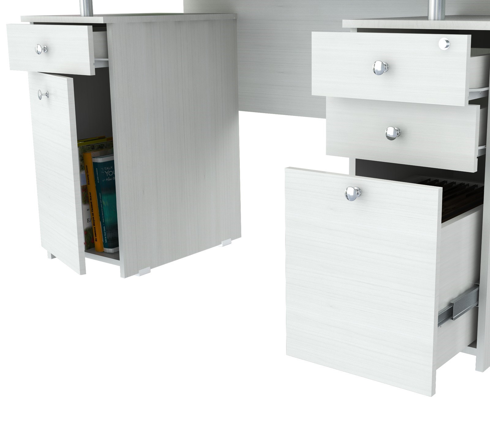 Computer Desk by Inval® finished in a rich “Washed Oak” laminate. This unit offers a 1” thick work area positioned on top of chrome metal risers. It features 2mm edge banding as well as two pedestals for ample storage. One pedestal has two accessory drawers and one file drawer. The file drawer can accommodate both letter and legal sized files and has full extension slides. The second pedestal has an additional accessory drawer and a storage compartment concealed by a door. Both drawers and door have brushed metal handles, and both pedestals include plastic base gliders to protect the unit when moving it. Constructed from manufactured wood laminated on both sides with durable melamine which is stain, heat and scratch resistant. Assembly required.