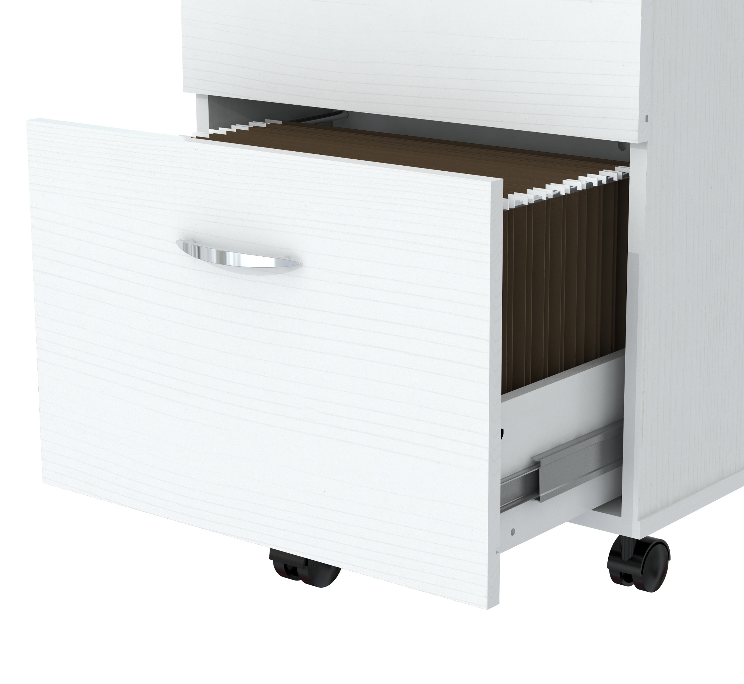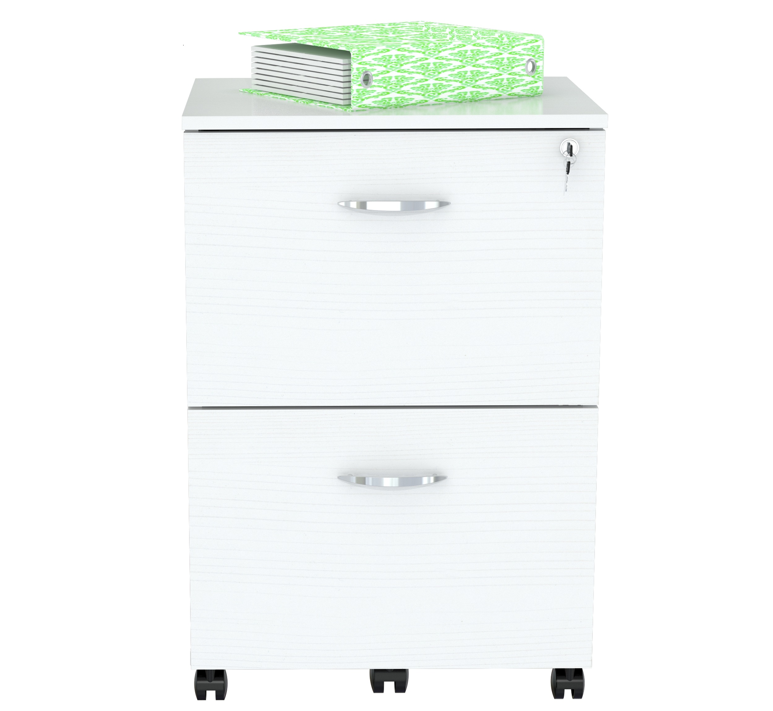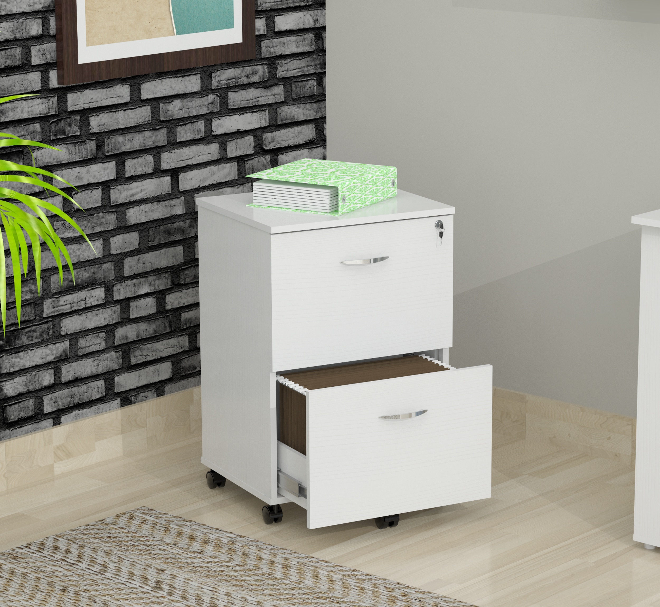 Uffici™ File Cabinet Collection by Inval® finished in a rich “Washed Oak” laminates in durable melamine which is stain, heat and scratch resistant. Constructed from manufactured wood. This commercial grade vertical mobile unit has a functional modern design that is an excellent choice for your home office or office. It features two drawers that can accommodate for both letter or legal sized files, full extension slides and the top drawers has a locking mechanism for added security. Both drawers have brushed metal handles and include five 2″ locking casters for security and mobility.