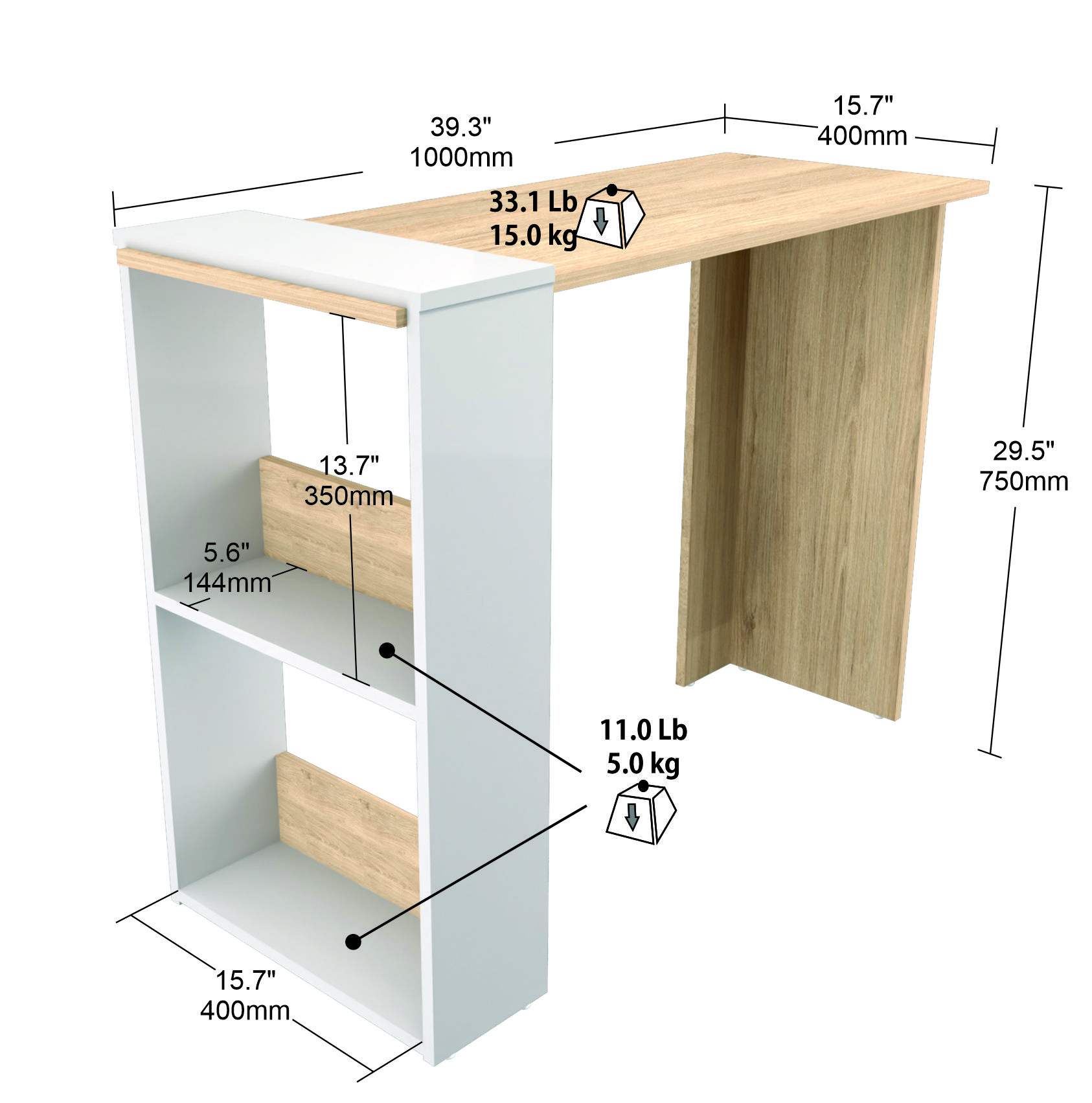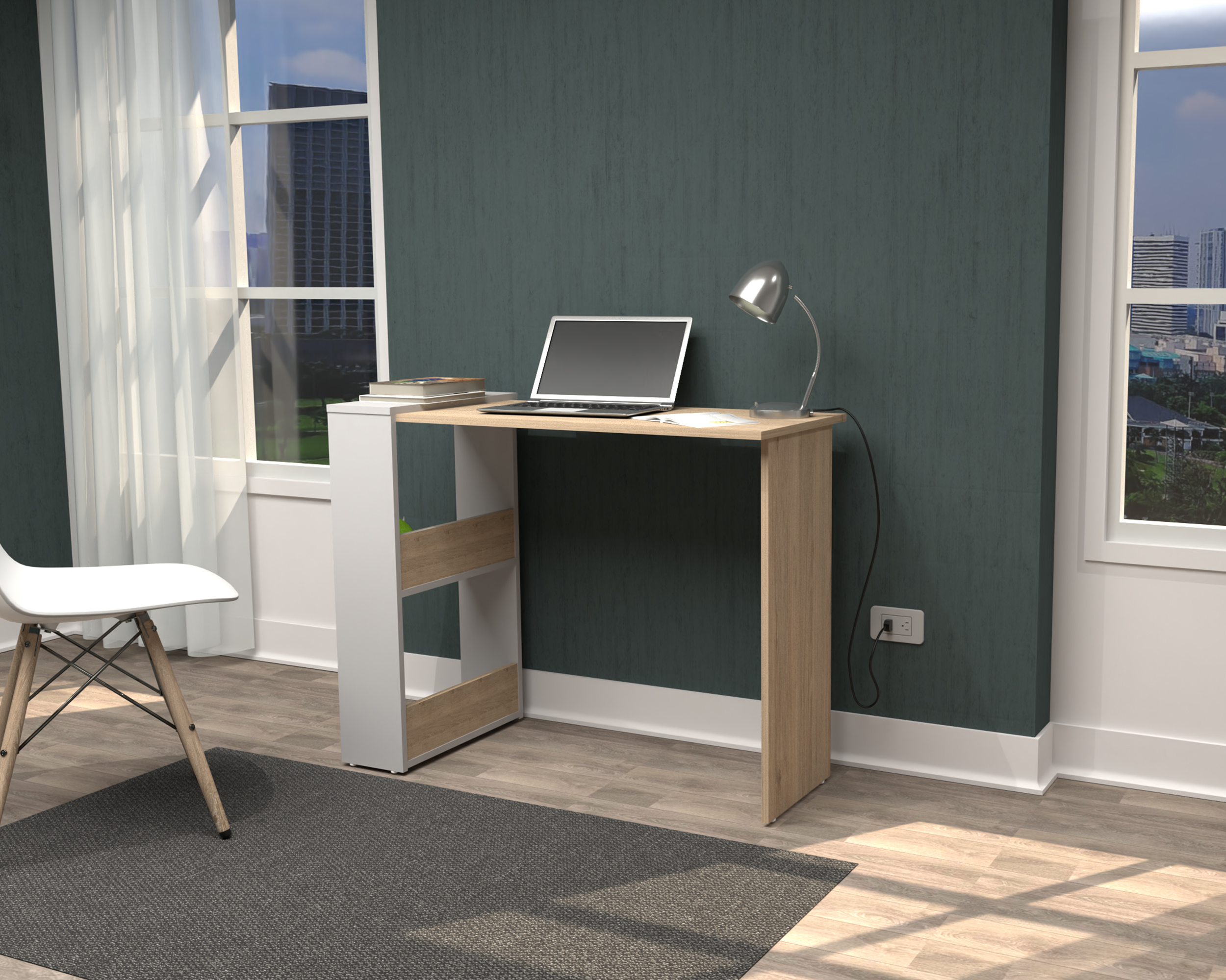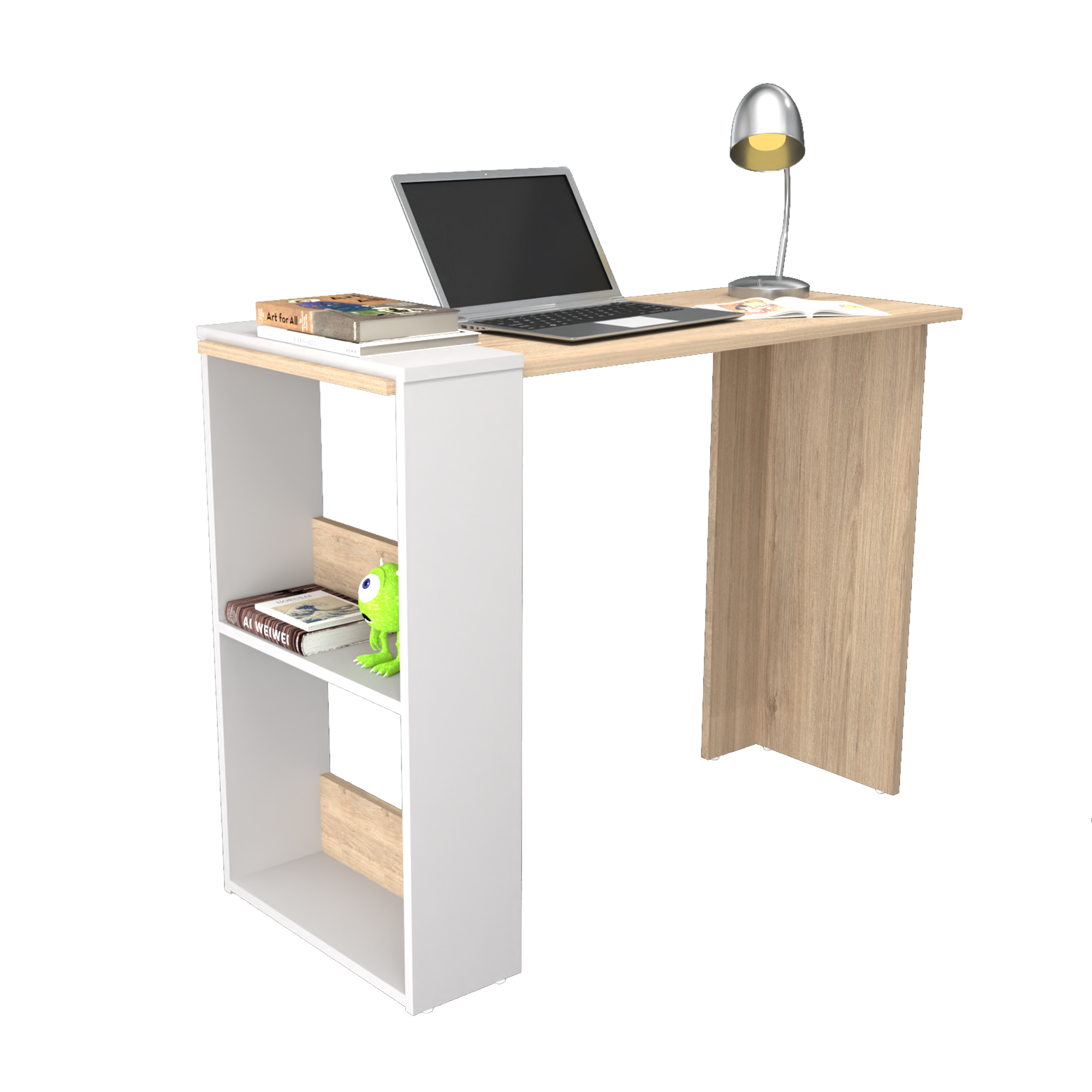 A unique desk with a two-level bookshelf leg in an elegant combination of sand and white finish. . Easy assembly required and manufacturer’s 1-year limited warranty is included